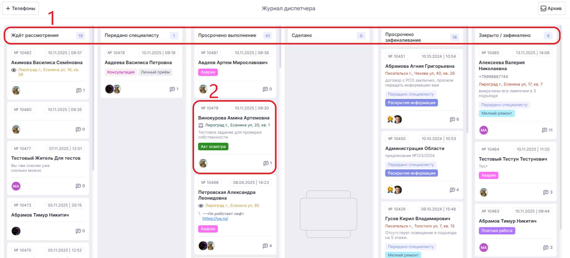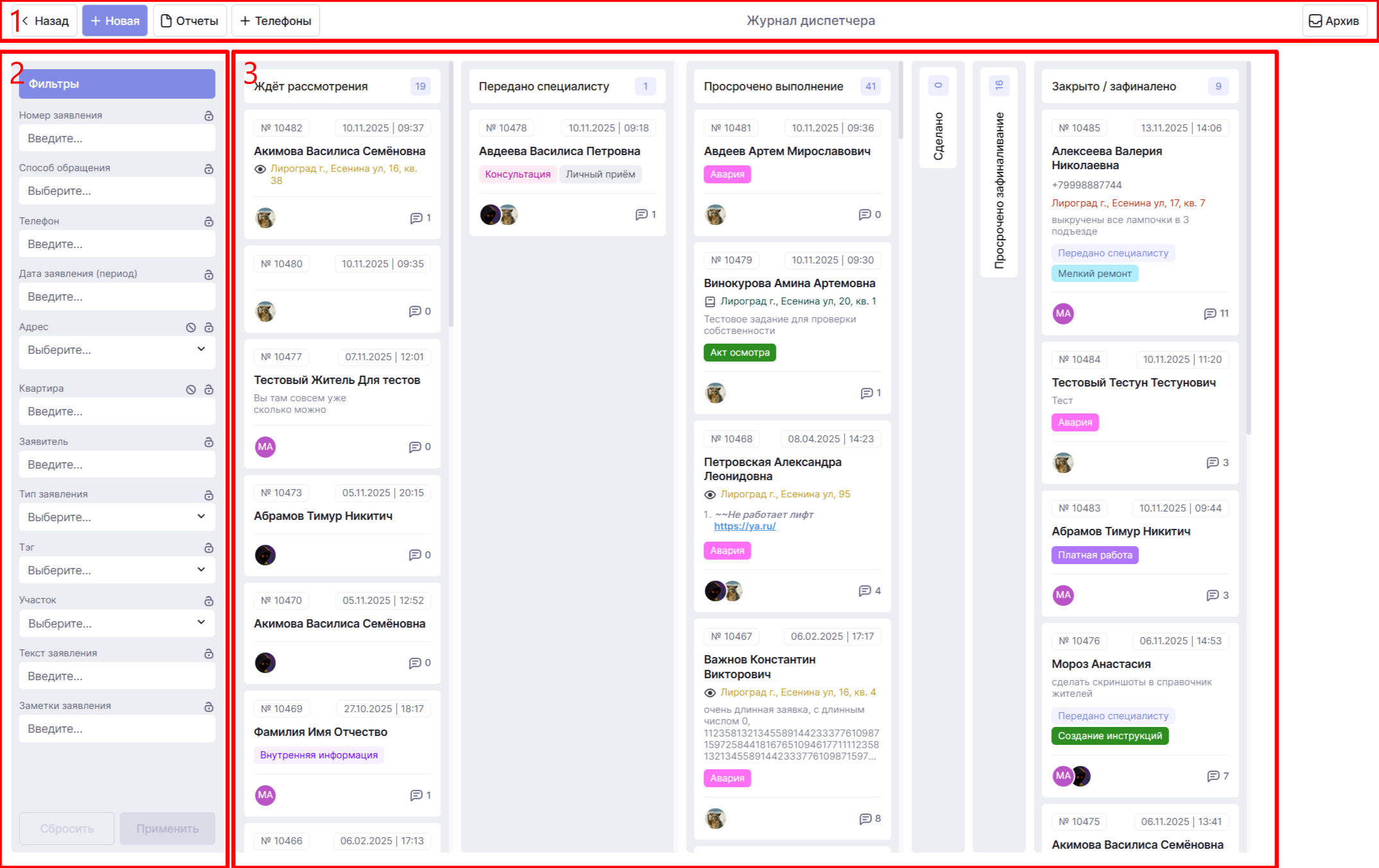 Журнал диспетчера — это центральное место, куда попадают все обращения жителей и клиентов. Здесь начинается работа с любой заявкой. Система объединяет все каналы связи: телефон, Telegram-бот, электронную почту и внутренние обращения сотрудников.